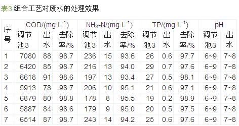 由圖3、圖4可知,MAP反應(yīng)沉淀池1中NH3-N去除率>85%,TP去除率穩(wěn)定在95%左右,出水NH3-N、TP分別≤500、400 mg/L。再經(jīng)MAP反應(yīng)沉淀池2處理后,進入調(diào)節(jié)池3的廢水NH3-N、TP分別穩(wěn)定在200、30 mg/L以下。由表3可知,調(diào)節(jié)池3有機物濃度較高且波動較大,但經(jīng)改造后的組合工藝處理后,出水污染物維持在較低水平且水質(zhì)較穩(wěn)定,說明改造后的組合工藝有較強的抗沖擊負荷能力。綜合圖3~圖4及表3可知,整個改造后的工藝對COD、TP的去除率均在97%以上,NH3-N去除率也在93%以上,出水各項指標均達到化學合成類制藥工業(yè)水污染物排放標準要求(GB 21904—2008)。