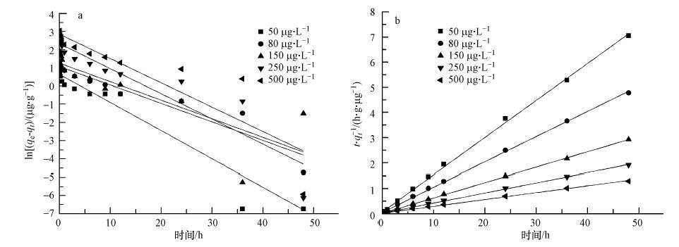 在納米鐵投加量為4 g · L-1,溫度為25 ℃時,取不同濃度的芴溶液,分別采用準一級動力學方程(3)(Vijayaraghavan et al., 2006)和準二級動力學方程(4)(Ho,1995)對吸附動力學過程進行擬合.