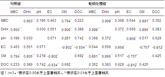 表 1 對照組和蚯蚓處理組MBC、DHA、pH、EC、OM、DOC相關(guān)矩陣