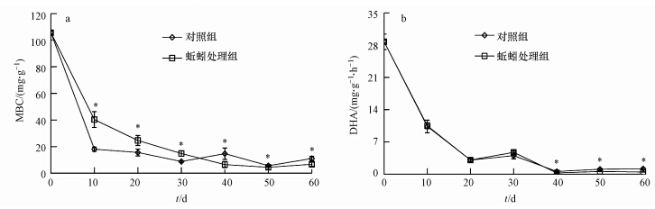 圖 2a顯示,前30 d蚯蚓處理組MBC顯著高于對照組(p<0.05),之后又顯著低于對照組(p<0.05),穩(wěn)定在4.45~6.49 mg · g-1之間.這可能是因?yàn)榍捌隍球攫ひ杭芭判刮飳ξ⑸锏拇碳ぷ饔么龠M(jìn)了微生物的增長(Aira et al., 2007);而后期隨著營養(yǎng)物質(zhì)的不斷減少,蚯蚓取食微生物的作用導(dǎo)致蚯蚓處理組MBC顯著低于對照組.