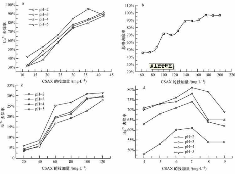 ·CSAX對(duì)水中重金屬離子Cu2+、Pb2+、和Cr(Ⅵ)有較高的去除率,但對(duì)Ni2+的去除效果不佳;