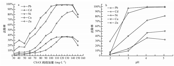 取質(zhì)量濃度相同(均為25 mg · L-1)的Cd(Ⅱ)、Cu(Ⅱ)、Ni(Ⅱ)、Pb(Ⅱ)、Zn(Ⅱ)混合離子水樣,調(diào)節(jié)pH為6.0,投加不同量的CSAX,或固定CSAX投加量,調(diào)節(jié)pH為不同值,進(jìn)行絮凝實(shí)驗(yàn),結(jié)果如圖 6所示.