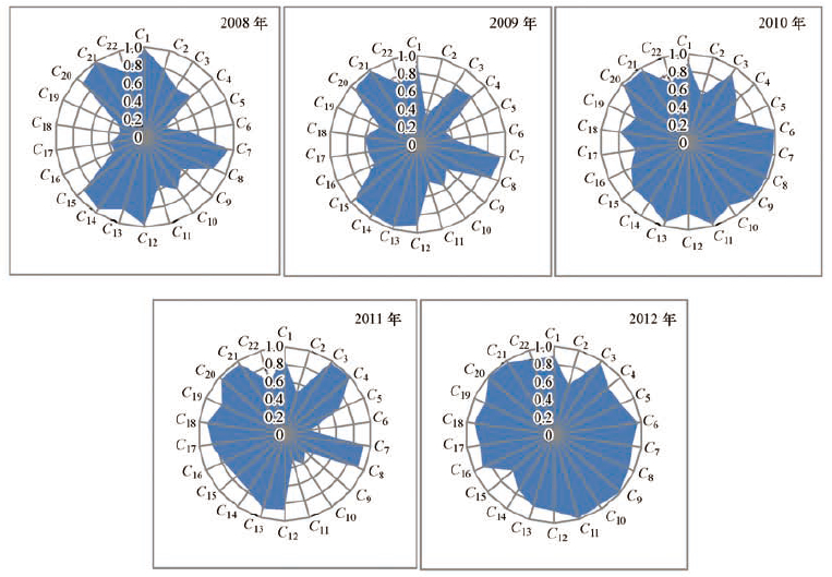 整體來看,從2008年至2012年,雷達圖覆蓋的面積越來越增大,說明洞庭湖生態(tài)經(jīng)濟區(qū)生態(tài)承載力發(fā)展過程的信息交流越來越強烈,系統(tǒng)結(jié)構(gòu)逐漸完善.2008年到2009年覆蓋面積相似,說明這兩年間各指標的結(jié)構(gòu)狀態(tài)沒有發(fā)生較大變化.相比于前兩年,2010年到2012年萬元GDP能耗(C16)、農(nóng)藥施用強度(C17)、環(huán)保支出占財政比重(C18)和人均國內(nèi)生產(chǎn)總值(C19)的較大發(fā)展使其對生態(tài)承載力的貢獻變大,指標均衡度提高,促進生態(tài)承載力發(fā)展結(jié)構(gòu)的完善.2010年和2012年洞庭湖生態(tài)經(jīng)濟區(qū)的地表水資源量(C9)、地下水資源量(C10)和人均水資源量(C11)三方面指標的較高水平使該地區(qū)生態(tài)承載力的系統(tǒng)結(jié)構(gòu)有了明顯的改善,各指標發(fā)展更均衡,生態(tài)承載力水平大幅提高.這與當?shù)氐膶嶋H情況相符,2010年和2012年洞庭湖生態(tài)經(jīng)濟區(qū)年人均水資源總量分別為2430.914 m3和2480.617 m3,遠高于其他年份,促使這兩年洞庭湖生態(tài)經(jīng)濟區(qū)的生態(tài)承載力達到兩個較協(xié)調(diào)穩(wěn)定的發(fā)展狀態(tài),從而造成2011年生態(tài)承載力水平異常發(fā)展的現(xiàn)象.
