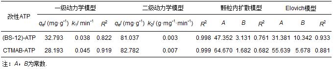 (BS-12)-ATP和CTMAB-ATP對COD的吸附分別采用表 1中的準一級動力學模型、準二級動力學模型、Elovich 模型和顆粒內(nèi)擴散模型對上述吸附過程進行擬合,結果如表 2所示.結果發(fā)現(xiàn),二級動力學模型和Elovich 模型擬合效果較好(圖 9b、圖 9d),這與Huang等(2007)用十八烷基三甲基氯化銨改性ATP對苯酚的吸附結果一致,說明化學吸附是凹凸棒石去除有機污染物的主要機制(Chen et al., 2009).從R2值比較可知,二級動力學方程能夠較好地描述兩種吸附劑對COD的吸附動力學特征,且擬合得到的兩種吸附劑對COD的表觀吸附量(qe)大小為:CTMAB-ATP>(BS-12)-ATP;且以CTMAB-ATP吸附COD的二級表觀吸附速率常數(shù)值(k2)最大,這與CTMAB-ATP比(BS-12)-ATP在快速吸附階段吸附速率大的結果相一致(圖 8).另外,由表 2可知,用顆粒內(nèi)擴散模型擬合得到的常數(shù)A≠0,說明吸附過程復雜,存在一定的離子內(nèi)擴散過程.