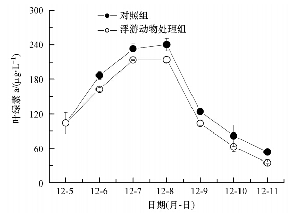 待池中水體的葉綠素a濃度增加到(104.15±18.63)μg · L-1時(shí)接入以婆羅異劍水蚤為主的浮游動(dòng)物. 盡管其在浮游植物細(xì)胞濃度已經(jīng)很高的情況下已不能抑制水華的發(fā)生,但其攝食作用對(duì)浮游植物細(xì)胞濃度的增加仍表現(xiàn)出明顯的抑制效應(yīng)并使其消退加速(圖 3).添加浮游動(dòng)物組水體的葉綠素a比對(duì)照組(未添加浮游動(dòng)物)低18.62~26.08 μg · L-1,平均為21.24 μg · L-1,且差異顯著(p<0.05).