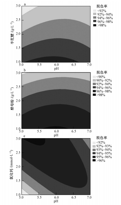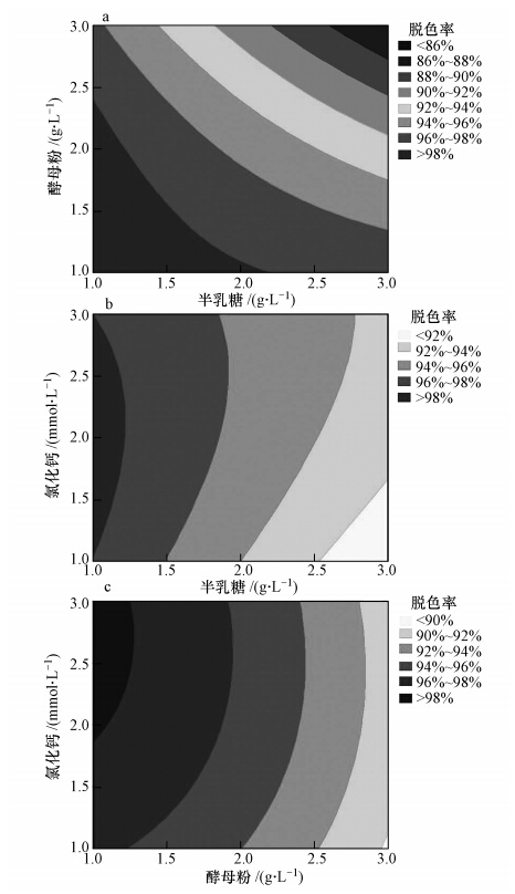 圖 6顯示了半乳糖濃度和酵母粉、氯化鈣濃度之間以及酵母粉濃度和氯化鈣濃度之間的顯著的交互作用及其對脫色的聯(lián)合影響.圖 6a和6b表明隨著半乳糖濃度的逐漸升高,脫色率隨酵母粉和氯化鈣濃度的升高而呈現(xiàn)降低趨勢.由圖 6c可知,隨著酵母粉濃度的逐漸升高,脫色率隨氯化鈣濃度的升高也呈現(xiàn)降低趨勢.