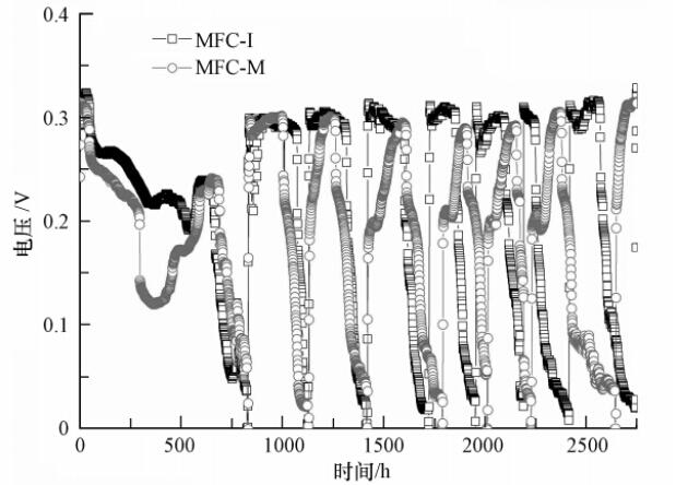 在外接1000 Ω電阻的條件下,兩種接種源接種的MFC的輸出電壓隨時(shí)間的變化如圖 1所示.在接種后約800 h內(nèi)(啟動(dòng)階段),MFC-I和MFC-M的輸出電壓均表現(xiàn)出波動(dòng)上升趨勢(shì),但MFC-I的輸出電壓略高于MFC-M.進(jìn)入穩(wěn)定運(yùn)行階段后,MFC-I和MFC-M的輸出電壓差別不大.
