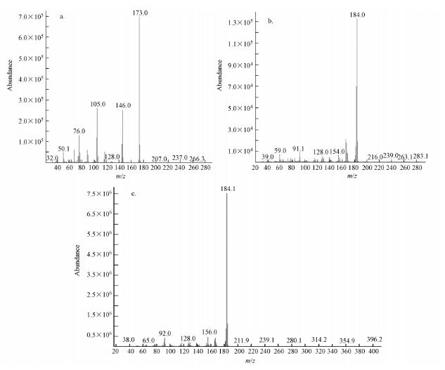 圖 5 穩(wěn)定運(yùn)行階段周期末MFC-I和MFC-M陽(yáng)極脫色產(chǎn)物質(zhì)譜圖(a.2-氨基-1,4-萘醌,b.2,2′-二氨基聯(lián)苯,c.聯(lián)苯胺) |