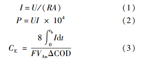 式中,I為單位面積電流密度(mA · cm-2),U為外電路電壓(V),R為電阻(Ω),A為電極面積(cm2),P為單位面積功率密度(mW · m-2),F(xiàn)為法拉第常數(shù)(C · mol-1),VAn為陽(yáng)極室液體體積(cm3),tb為周期時(shí)間(s),ΔCOD為周期初與周期末的COD變化值(mg · L-1),CE為庫(kù)倫效率.