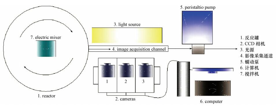 裝置示意圖如圖 1所示,整個(gè)反應(yīng)過(guò)程在反應(yīng)槽內(nèi)進(jìn)行,少量反應(yīng)懸濁液在蠕動(dòng)泵的工作下以一定流速通過(guò)側(cè)向打開(kāi)的圖像采集通道,圖像采集通道尺寸為3 mm×50 mm×200 mm;打開(kāi)光源控制器,將相機(jī)對(duì)焦以看清通道內(nèi)絮體,相機(jī)采集流經(jīng)通道的懸浮顆粒圖像并將圖像保存在計(jì)算機(jī)上待軟件分析.