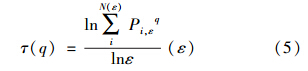配分函數(shù)與尺度ε存在冪函數(shù)關(guān)系Iq(ε)= ετ(q),兩邊取對(duì)數(shù),則可得到