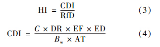 健康風(fēng)險(xiǎn)分別采用致癌風(fēng)險(xiǎn)和非致癌風(fēng)險(xiǎn)進(jìn)行表征.通常認(rèn)為致癌性物質(zhì)和非致癌性物質(zhì)有完全不同的致毒機(jī)理,即化學(xué)致癌物是在基因水平上產(chǎn)生毒效應(yīng),而非致癌物則在細(xì)胞甚至更大的尺度上產(chǎn)生毒效應(yīng),在評價(jià)方法上非致癌物質(zhì)的評價(jià)是基于一種非線性模型,而致癌物質(zhì)的評價(jià)則基于線性模型;但是實(shí)際上化學(xué)物質(zhì)的致癌毒性和非致癌毒性難以完全區(qū)分(Butterworth et al., 1999).所以本研究在進(jìn)行健康風(fēng)險(xiǎn)評價(jià)時(shí)對污染物的致癌風(fēng)險(xiǎn)與非致癌風(fēng)險(xiǎn)進(jìn)行評價(jià).一般認(rèn)為生物體對非致癌物的反應(yīng)有劑量閾值,低于閾值則認(rèn)為不會(huì)產(chǎn)生不利于健康的影響,非致癌風(fēng)險(xiǎn)計(jì)算方法如式(3)、(4)所示(USEPA,1986):