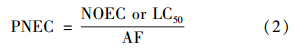 預(yù)測無效應(yīng)濃度(predicted no effect concentration,PNEC)是一種常用的生態(tài)風(fēng)險(xiǎn)參考劑量,但是PNEC通過實(shí)驗(yàn)難以直接獲得,常通過慢性毒性數(shù)據(jù)外推獲得,即以無顯著效應(yīng)濃度(NOEC)或半數(shù)致死濃度(LC50)與外推因子(AF)的比值作為PNEC,如式(2)所示.世界經(jīng)濟(jì)合作組織(Organization for Economic Cooperation and Development,OECD)傾向于使用規(guī)定的評估因子(10~1000)作為外推因子(USEPA,1985; OECD,1995).