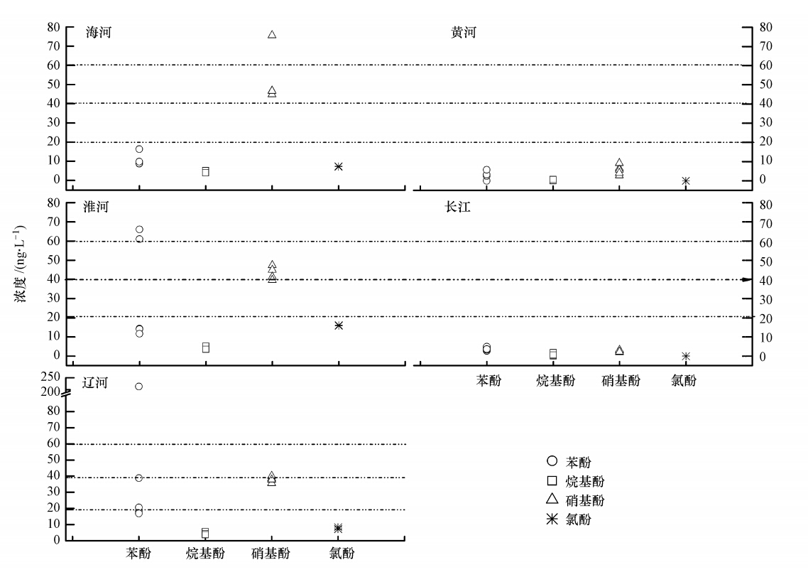 我國目前對酚類物質(zhì)的研究主要集中在單個(gè)河段、湖庫或城市尺度(馮艷紅等,2007;楊建麗等,2009;張兵等,2001;Zhong et al., 2010),對其在全國范圍內(nèi)的濃度分布特征的研究也只是幾種單個(gè)的氯酚化合物,如高繼軍等研究了2,4-二氯苯酚,2,4,6-三氯苯酚和五氯酚在我國地表水中的分布情況(Gao et al., 2008).