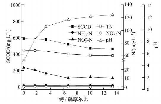選用Ca(OH)2作為除磷劑,分別考察了不同鈣磷摩爾比(1.7、3.3、6.7、10.0、13.3)和對臭氧處理后污泥上清液的除磷效果以及SCOD、氮、pH的影響.