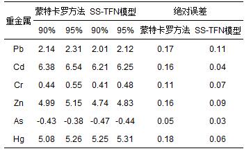 為了驗(yàn)證采用蒙特卡羅方法和三角模糊數(shù)耦合模型比單純的運(yùn)用蒙特卡羅方法進(jìn)行隨機(jī)模擬的優(yōu)越性,本文在模擬計(jì)算40000次的情況下,分別計(jì)算概率為90%與95%時(shí)各種重金屬地累積指數(shù)模擬結(jié)果之間的絕對(duì)誤差值,結(jié)果見表 10.