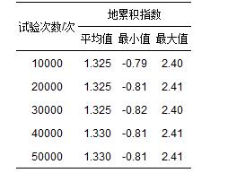 將表 5中經(jīng)三角模糊數(shù)處理后的重金屬監(jiān)測數(shù)據(jù)和地球化學(xué)背景值,根據(jù)2.2.2節(jié)的處理方法,利用Crystal Ball模擬軟件進(jìn)行隨機(jī)模擬.根據(jù)式(5),可得到地累積指數(shù)的隨機(jī)模擬序列{Ij j=1,2,…,m },m為隨機(jī)模擬的試驗(yàn)次數(shù).分別進(jìn)行10000、20000、30000、40000、50000次隨機(jī)模擬,如重金屬Pb的模擬結(jié)果如表 6所示.