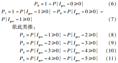 由式(6)~(12)得到重金屬對(duì)各污染等級(jí)的概率水平后,根據(jù)地累積指數(shù)污染等級(jí)劃分,得出待評(píng)重金屬的綜合污染值,具體見式(13).