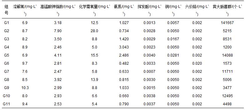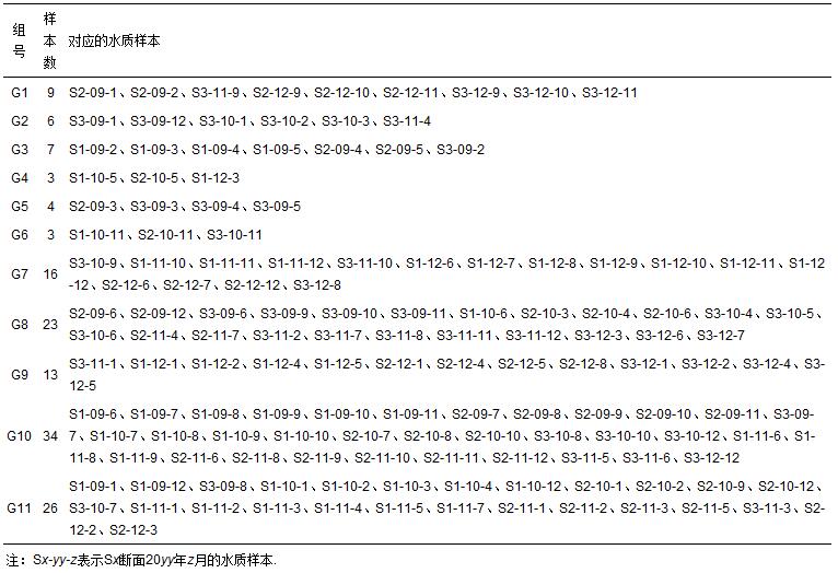 由表 5可見,11個組中,G1聚集了有較低溶解氧和較高糞大腸菌群濃度的水質樣本點,G2聚集了有較高高錳酸鉀指數和化學需氧量的樣本點,G3聚集了有較高氨氮和銅濃度的樣本點,G4聚集了有較高氨氮濃度的樣本點,G5聚集了有較高氨氮、揮發(fā)酚、銅和糞大腸菌群濃度的樣本點,G6聚集了有較高六價鉻濃度的樣本點,G10聚集了有較高揮發(fā)酚和糞大腸菌群濃度的樣本點,G7、G8、G9、G11中沒有明顯濃度較高或較低的水質評價指標.