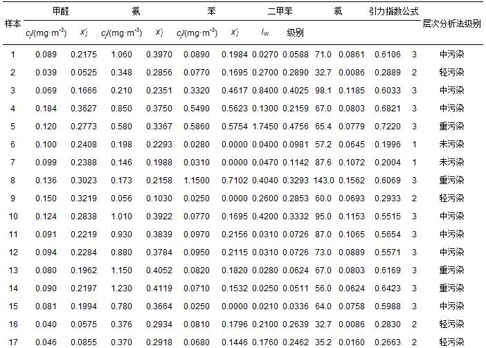2002年11—12月長春市30個室內(nèi)樣本5項指標監(jiān)測數(shù)據(jù)cj(湯紅巖等,2005),以及由式(1)和式(7)計算出的指標規(guī)范值x′j如表 11所示.由于樣本1、11~15、26和27的不同指標計算得到的規(guī)范值相差較大,因此,在用式(12)計算引力綜合指數(shù)時,需用式(13)對引力指數(shù)值進行加權(quán)計算,其余22個樣本的指標視作等權(quán),計算得到各樣本引力綜合指數(shù)值,并根據(jù)表 3中空氣環(huán)境質(zhì)量引力指數(shù)分級標準做出評價結(jié)果(表 11).表中還列出文獻(湯紅巖等,2005)中用層次分析評價法做出的評價結(jié)果.由于文獻(湯紅巖等,2005)中的層次分析評價法將室內(nèi)空氣污染劃分為清潔(1*級)、未污染(2*級)、輕污染(3*級)、中污染(4*級)和重污染(5*級)等5級;而本文引力指數(shù)法將其劃分為1級、2級、3級.二者對應關(guān)系為:(1*級清潔、2*級未污染)對應1級,(3*級輕污染)對應2級,(4*級中污染、5*級重污染)對應3級.由表 11可以看出,二種方法評價結(jié)果完全一致.具體參見污水寶商城資料或http://wlmqsb.com更多相關(guān)技術(shù)文檔。