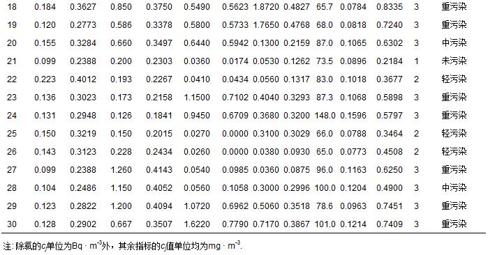 表 11 長春市30個室內(nèi)樣本監(jiān)測數(shù)據(jù)cj及其規(guī)范值 x′j和評價結(jié)果