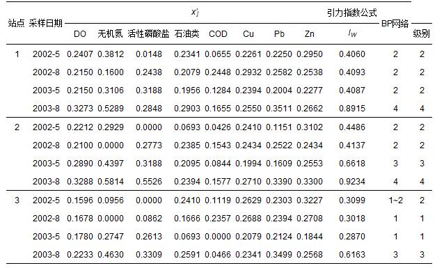 珠江口2002—2003年3個站點8項海水指標監(jiān)測數(shù)據(jù)cj(李占東等,2005)如表 7所示.由式(1)和式(4)計算出的指標規(guī)范值x′j如表 8所示.由于站點1的2003-8和站點2的2002-5,2002-8和2003-5樣本不同指標的規(guī)范值x′j相差較大,因而需用式(13)對引力指數(shù)值進行加權(quán)計算外.其余日期采樣點則視各指標為等權(quán),再用式(10)和式(12)計算得到各站點海水水質(zhì)引力綜合指數(shù)值,并根據(jù)表 3中海水水質(zhì)引力指數(shù)分級標準做出評價結(jié)果(表 8).表中還列出文獻(李占東等,2005)中用BP人工神經(jīng)網(wǎng)絡評價法做出的評價結(jié)果.可以看出,全部12個樣本2種方法的評價級別完全一致.