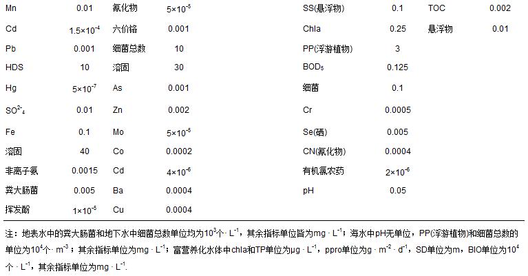 式(2)~(7)中,cj為指標j的實測值或標準值;cj0為設定的指標j的參照值,4類水體95項指標的參照值cj0和室內(nèi)、外空氣29項指標的參照值cj0分別如表 1和表 2所示.