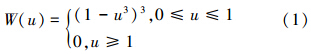 基于距離越近、相關(guān)性越強(qiáng)的假設(shè),賦予不同位置的點(diǎn)不同的權(quán)重并進(jìn)行局部加權(quán)回歸.該過(guò)程需要選定局部回歸的窗口長(zhǎng)度、回歸方程階數(shù)(d)及權(quán)重函數(shù)(W),常采用立方權(quán)重函數(shù):