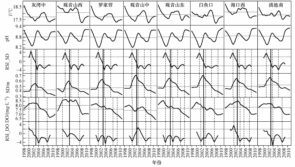 從SD變化趨勢(shì)圖上看,各個(gè)站點(diǎn)的變化趨勢(shì)一致,在2000年2月之前緩慢下降,至2002年8月(?谖髟2003年1月)升高并達(dá)到最大值,之后一直呈下降趨勢(shì),并在2010年底達(dá)到13年來(lái)最低值.在空間分布上,以滇池南最高、灰灣中最低.分析RSI的結(jié)果可知,SD在2000年1月附近顯著上升,之后到2004年1月附近顯著下降,期間為穩(wěn)定的高值狀態(tài),之后又有顯著下降的時(shí)間點(diǎn),2008年1月之后為穩(wěn)定低值.