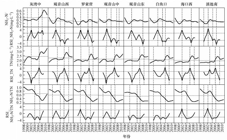 圖 5展示了NH3-N、TN和NH3-N/TN的變化趨勢(shì)及RSI結(jié)果.由圖可知,灰灣中NH3-N平均值顯著高于其它站點(diǎn),且變化趨勢(shì)亦異于其它站點(diǎn).灰灣中NH3-N濃度經(jīng)歷1次顯著下降和3次顯著上升過(guò)程,至2009年達(dá)到最大值,符合III類(lèi)水質(zhì)標(biāo)準(zhǔn);其他站點(diǎn)NH3-N濃度變化趨勢(shì)一致,在平均值附近波動(dòng),2008年后呈現(xiàn)下降趨勢(shì).
