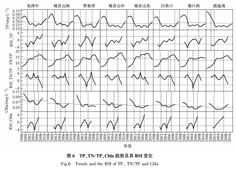 圖 6展示了TP、TN/TP和Chla的變化趨勢(shì)及RSI結(jié)果.由圖可知,各個(gè)站點(diǎn)的TP濃度總體趨勢(shì)一致,經(jīng)過(guò)短暫的上升(滇池南下降)后,開(kāi)始迅速下降,至2003年開(kāi)始在低值波動(dòng),從2009年開(kāi)始上升,并接近或者超過(guò)13年的平均值,除海口西和灰灣中,其他站點(diǎn)均未達(dá)到V類(lèi)水質(zhì)標(biāo)準(zhǔn).RSI圖的結(jié)果顯示,2002年附近區(qū)域TP濃度顯著下降,有4個(gè)站點(diǎn)2009年后的上升是顯著的.