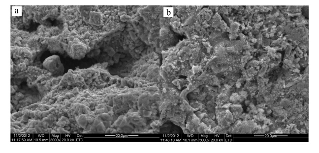 圖 5 不同形態(tài)海綿鐵的SEM(a. 處理前,b.處理后)
