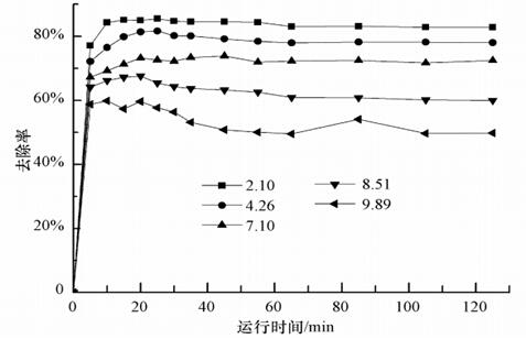 從圖 9可以看出,染料初始pH對(duì)iCWPO反應(yīng)器降解染料廢水有較大的影響.進(jìn)水pH在酸性范圍內(nèi),與進(jìn)水pH為7.10的條件相比,其出水染料的殘余濃度較低,說明酸性環(huán)境對(duì)iCWPO除染料廢水有促進(jìn)作用.前人研究表明,pH主要影響催化濕式的反應(yīng)歷程和活性金屬的溶出.pH值過低時(shí),出水pH也會(huì)相應(yīng)增大,不僅不能節(jié)約成本,還會(huì)造成二次污染.進(jìn)水pH在堿性范圍時(shí),出水效果下降較快,說明堿性環(huán)境不利于CWPO降解染料廢水.在pH值為4.65時(shí),iCWPO對(duì)染料的去除率達(dá)80%以上,因此,染料廢水的iCWPO可在弱酸條件下進(jìn)行.
