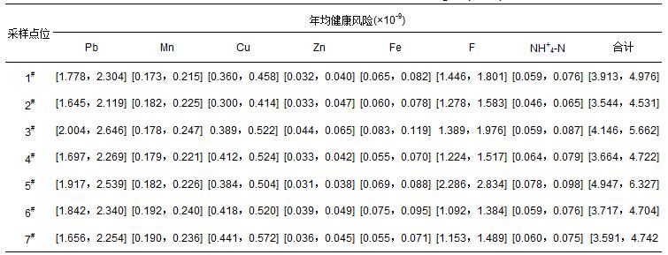 水源地有毒污染物按照水樣檢出與否,選取Cr6+、As、Cd、Pb、Mn、Cu、Zn、Fe、F、NH+4-N等10項(xiàng)檢出污染物作為健康風(fēng)險(xiǎn)指標(biāo),其中,Cr6+、As、Cd為化學(xué)致癌物,Pb、Mn、Cu、Zn、Fe、F、NH+4-N為非致癌化學(xué)有毒物.As采用原子熒光光譜儀測(cè)定,Cr、Cd、Pb、Mn、Cu、Zn、Fe采用原子吸收光譜儀測(cè)定,NH+4-N采用納氏試劑分光光度法測(cè)定,F(xiàn)采用離子色譜儀測(cè)定.為了保證數(shù)據(jù)的準(zhǔn)確性,進(jìn)行了平行樣的測(cè)定,結(jié)果表明,RSD均小于10%,準(zhǔn)確程度符合要求.具體監(jiān)測(cè)濃度統(tǒng)計(jì)結(jié)果如表 1所示.