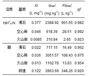 Langmuir等溫吸附模型中的K值為吸附結(jié)合能,K值越大,表示填料與溶質(zhì)的結(jié)合越穩(wěn)定.從表 4可以看出,各填料與NH+4-N之間的結(jié)合能大小順序?yàn)榉惺?gt;空心磚>火山巖;各填料與磷之間的結(jié)合能大小順序?yàn)殇撛?gt;空心磚>沸石>火山巖.Kqmax為最大緩沖容量,反映固液體系吸附溶質(zhì)時(shí)的緩沖能力(趙桂瑜,2007).將各填料進(jìn)行比較,對(duì)NH+4-N緩沖容量最大的填料為沸石,對(duì)磷緩沖容量最大的為鋼渣,空心磚次之.這說明即使溶液污染物濃度變化較大時(shí),這些填料對(duì)相應(yīng)污染物仍能維持較好的去除效果.因此,沸石是較好凈化NH+4-N,鋼渣、空心磚是較好的凈化磷的人工濕地填料.