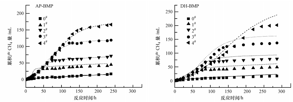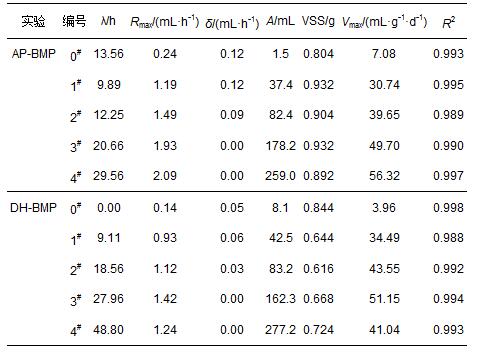 應(yīng)用改進(jìn)的Gompertz模型對AP-BMP、DH-BMP產(chǎn)氣進(jìn)行回歸后的參數(shù)如表 2所示.兩廠的厭氧污泥產(chǎn)氣數(shù)據(jù)與改進(jìn)的Gompertz模型擬合較好(R2>0.99).通常厭氧消化過程中的限速步驟為水解破壁過程(Noike et al., 1985),在無添加外來基質(zhì)的0#樣品中,AP、DH厭氧污泥的遲滯期分別為13.56、0 h,表明DH厭氧污泥的活性較高.投加基質(zhì)NaAc對厭氧污泥具有一定的抑制作用,且抑制作用隨基質(zhì)濃度的提高而提升.DH厭氧污泥4#條件下遲滯期達(dá)到48.80 h,可能與4#樣品中S/X最高(0.67)有關(guān).Prashanth等(2006)指出,較高的S/X比造成的氨氮和揮發(fā)酸的積累,對厭氧菌群產(chǎn)生一定的抑制作用,通常較低S/X值下的遲滯期較短(Chen et al., 1996).而在AP-BMP實(shí)驗(yàn)中,無添加基質(zhì)的0#的遲滯期達(dá)到了13.56 h,高于添加添加基質(zhì)的1#、2#.這可能是由于AP厭氧污泥的反應(yīng)活性較差,在無基質(zhì)添加條件下需調(diào)整造成的.