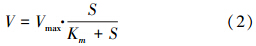 底物的厭氧代謝過程實(shí)質(zhì)上是一系列的酶促反應(yīng),因此,采用Michaelis-Menten模型描述基質(zhì)濃度與比產(chǎn)氣速率的關(guān)系: