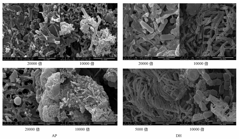 SEM鏡檢AP、DH厭氧污泥結(jié)果如圖 4所示.AP厭氧污泥鏡檢中發(fā)現(xiàn)了較為稀疏的髦毛菌,同時(shí)還存在著1~2 μm的短桿菌、7~10 μm的長桿菌和直徑為2 μm的產(chǎn)CH4微粒菌.這些菌群較為分散,菌群間的協(xié)同作用不強(qiáng).DH厭氧污泥菌群與AP污泥相比豐富多樣,在基質(zhì)上依附著大量的髦毛菌,與T-RFLP檢測的結(jié)果較為吻合.同時(shí)還存在著1~2 μm的短桿菌、7~10 μm的長桿菌和雙疊球菌等常見的產(chǎn)CH4菌.這些產(chǎn)CH4菌互相交錯(cuò)、依賴形成了豐度較高的產(chǎn)CH4菌群,與DH厭氧污泥實(shí)驗(yàn)的較佳的產(chǎn)CH4活性相吻合.具體參見污水寶商城資料或http://wlmqsb.com更多相關(guān)技術(shù)文檔。