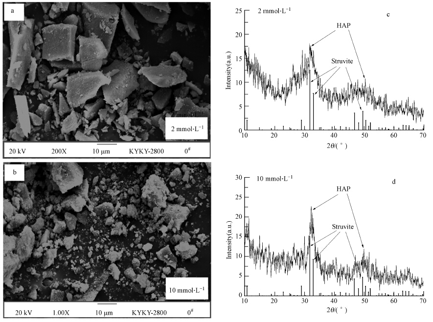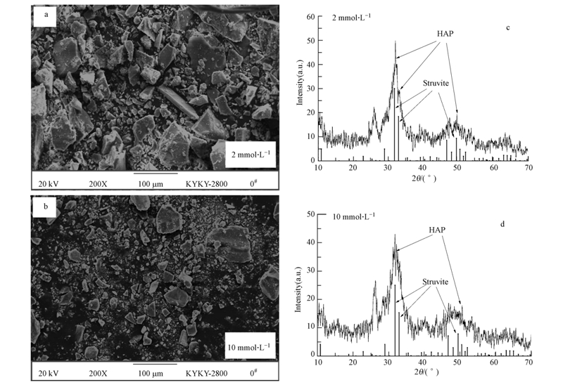 圖 7表示的是溶液pH值為9.0條件下,乙酸濃度分別為2和10 mmol · L-1時所得CP結晶沉淀反應產物SEM照片與XRD分析圖譜.從圖中可以看出,在不同乙酸濃度下得到的結晶產物形貌均呈 不規(guī)則塊狀(圖 7a、b),晶體產物的形狀沒有發(fā)生明顯變化,但晶粒大小有所不同.隨著溶液中乙酸濃度的增加,反應所得顆粒體積明顯變小,沉淀性能降低.從圖 7c、d可見,通過將X射線衍射圖譜的三強峰與標準峰對照,可以確定晶體結構為磷酸鈣(Ca5(PO4)3OH),結晶產物基本一致.乙酸對結晶產物的形狀及成分均沒有明顯影響,但會影響產物體積大小,進而影響其沉淀性能.具體參見污水寶商城資料或http://wlmqsb.com更多相關技術文檔。