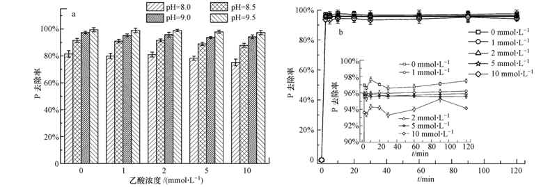 在一定pH值條件下,乙酸濃度對CP結晶沉淀反應溶液中磷的最終去除率影響很小.從圖 6a中可以看出,當pH值為8.0時,溶液中乙酸濃度從0 mmol · L-1 增加到10 mmol · L-1,磷的去除率僅下降5%左右.當pH值為8.5、9.0和9.5時,不同濃度乙酸對磷的去除率幾乎沒有影響.此外,不同乙酸濃度對磷的去除速率也基本上沒有影響,CP結晶沉淀反應均能在5 min內達到平衡(圖 6b).由于乙酸也可能與Ca2+按反應式(4)發(fā)生絡合作用,但這種絡合程度較弱,因此,乙酸對磷酸鈣結晶反應影響很小.