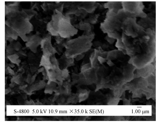 SEM被用來表征磁性竹基炭(BBMC)的表面形貌(圖 1).由圖 1可知,BBMC的主體是寬度為0.8 μm左右、厚度為納米級的薄片層結(jié)構(gòu),而磁性納米Fe3O4為顏色較亮的部分.BBMC片層的大小及形貌與石墨烯的SEM圖十分相似.因?yàn)橹穹劢?jīng)過濃硫酸浸泡活化,所以BBMC片層表面都有許多含氧、含氫氧基團(tuán).經(jīng)過微波照射而不是高溫加熱的BBMC,表現(xiàn)出了不同于一般的活性炭的形貌和特征,而是類似石墨片的特性,此材料能夠?yàn)槲劫|(zhì)提供大量的表面活性位點(diǎn).