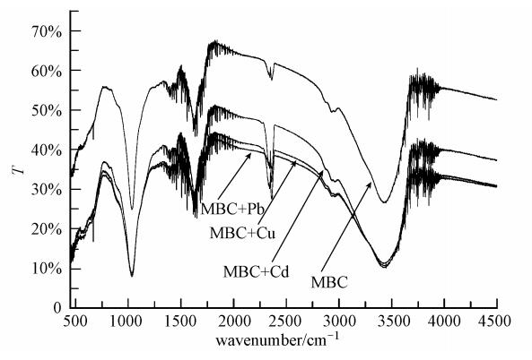 圖 2 BBMC吸附重金屬前后的FTIR譜圖