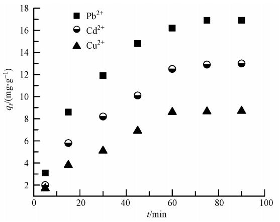 吸附動力學(xué)實(shí)驗(yàn)在HZS-H25水浴振蕩器中進(jìn)行,條件如下:溫度30 ℃,pH值為4.0,吸附劑投加量為50 mg,3種金屬離子(Pb2+、Cd2+和Cu2+)的初始濃度均為10 mg · L-1,溶液的體積為100 mL.分別于第5、15、30、45、60、75、90 min時(shí)采樣測定溶液中的離子濃度.