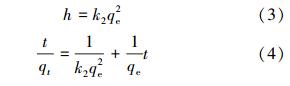 式中,qt、qe分別表示在吸附t時(shí)及平衡時(shí)的吸附量(mg · g-1),c0為離子的初始濃度(mg · L-1),ct、ce分別表示吸附t時(shí)后及平衡時(shí)溶液中離子的濃度(mg · L-1),V為溶液的體積(L),m為吸附劑投加量(g).