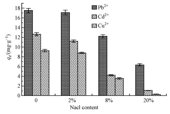 低的pH值對吸附有負(fù)影響是因?yàn)榇罅看嬖诘乃蠚潆x子與BBMC表面的含氧基團(tuán)之間的氫鍵作用,占據(jù)了吸附位點(diǎn),阻礙了離子交換作用.Pb2+、Cd2+與Cu2+的離子半徑分別為0.119、0.078和0.057 nm.因?yàn)樵?種正二價(jià)金屬陽離子中,Pb2+水合離子半徑最小且堿性較弱不容易發(fā)生水解,在溶液中傳質(zhì)阻力小,所以更容易進(jìn)行離子交換.