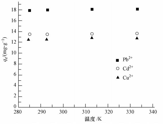 通過設(shè)置4個(gè)梯度的溫度,在恒溫振蕩吸附90 min后,測定BBMC對3種金屬離子的吸附量(圖 6).結(jié)果顯示,3種金屬陽離子在所有溫度下的平衡吸附量的變化都小于2%,即溫度對Pb2+、Cd2+與Cu2+在BBMC上的吸附幾乎沒有影響.