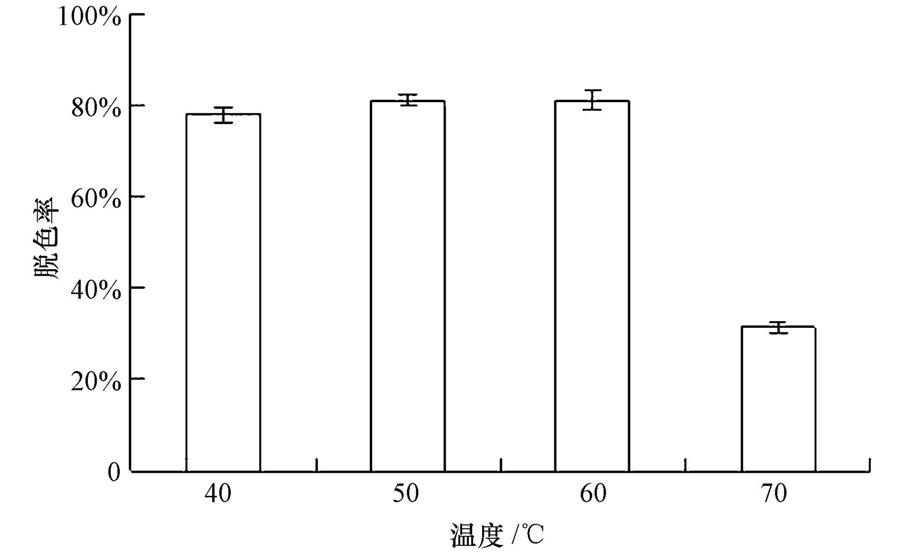 在pH 5.0、加酶量6 U · mL-1、染料濃度0.1 g · L-1條件下,分別設(shè)定溫度為40、50、60、70 ℃,保溫60 min.研究溫度對漆酶催化酸性黑ATT脫色的影響,結(jié)果(圖 4)表明,在40~60 ℃范圍內(nèi),脫色率變化不大,脫色率最高可達(dá)81%.G. lucidum所產(chǎn)漆酶為耐熱性酶,在60 ℃時的半衰期為2 h,4 h后殘存酶活為25%,但70 ℃時酶活快速下降,本研究結(jié)果與之相一致,當(dāng)溫度為70 ℃時,脫色率明顯減小,因?yàn)闇囟冗^高會導(dǎo)致酶蛋白變性,使酶的活性大幅下降,導(dǎo)致脫色率降低.