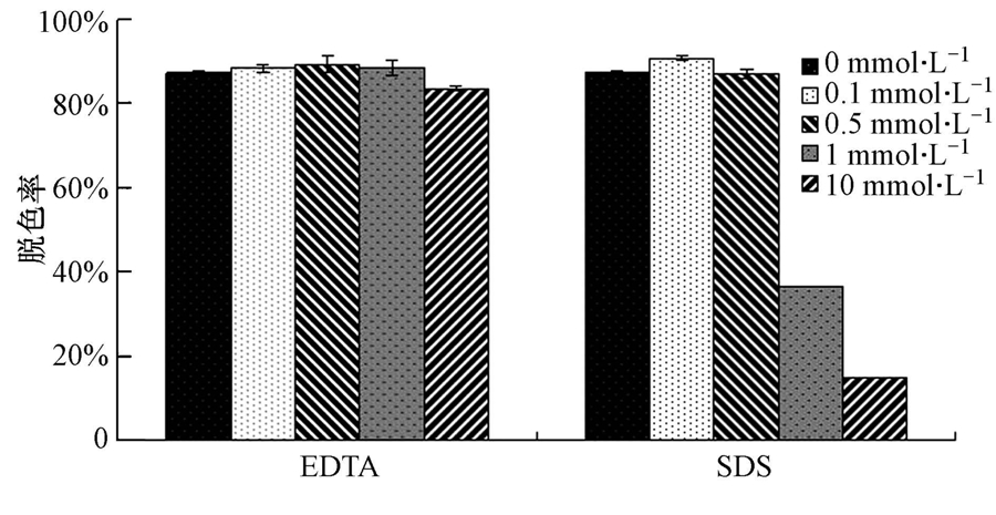 EDTA-鈉是一種絡(luò)合劑能夠與金屬陽離子形成高度穩(wěn)定的水溶性絡(luò)合物,EDTA-鈉能夠與漆酶的銅離子結(jié)合,從而改變漆酶的活性結(jié)合位點(diǎn);SDS是一種離子型去污劑,可使蛋白質(zhì)變性.在正交試驗(yàn)所得的最優(yōu)條件下,分別加入0、0.1、0.5、1、10 mmol · L-1的EDTA-鈉、SDS,探究酶抑制劑對脫色率的影響.結(jié)果(圖 8)表明,EDTA-鈉對脫色的抑制作用不顯著,加入量達(dá)10 mmol · L-1時才顯現(xiàn)一定的抑制效果.SDS對脫色的抑制作用很強(qiáng),濃度為10 mmol · L-1時脫色率降低了68%.