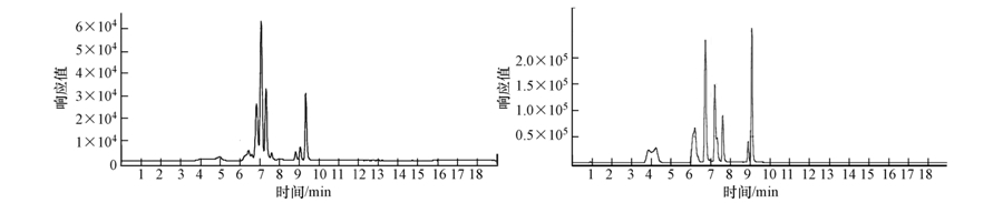 ZORBAX EclipseC18柱(3.5 μm,2.1 mm×100 mm,美國Agilent);流動相中的無機相為0.3%甲酸,有機相為甲醇與乙腈比例為1 ∶ 1的混合溶液.A為有機相,B為無機相.梯度洗脫的過程為:0~1 min,10% A;1~6 min,10%~88% A;9.5~11.5 min,100% A;11.5~15.5 min,100%~10% A;15.5~19 min,10% A.測定過程中Gas Flow保持在10 L · min-1,柱溫箱溫度為25 ℃,進樣量為10 μL,進樣帶洗針,流速為0.3 mL · min-1.