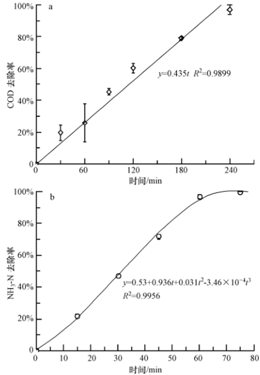 在電流密度50 mA · cm-2、稀釋比1 ∶ 2、pH值未調(diào)節(jié)、極板間距為15 mm的最優(yōu)工況下,平行進(jìn)行3組電化學(xué)氧化榨菜廢水試驗(yàn).利用Origin 8.5軟件對BDD電極電化學(xué)氧化榨菜廢水的COD、NH3-N去除率進(jìn)行擬合,結(jié)果如圖 7所示.由圖 7a可知,COD去除率滿足線性擬合方程y=0.435t,R2值為0.9899;電化學(xué)氧化240 min時COD去除率達(dá)到96.9%.利用BDD Diachem anode 處理垃圾滲濾液時有機(jī)物濃度的變化同樣滿足線性變化.Elaoud 等(2011)則認(rèn)為當(dāng)電化學(xué)氧化過程受傳質(zhì)過程控制時,有機(jī)物去除率滿足偽一級反應(yīng)動力學(xué)方程.由圖 7b可知,NH3-N去除率滿足多項(xiàng)式擬合方程y=0.53+0.936t+0.031t2-3.46×10-4t3,R2值為0.9956;電化學(xué)氧化75 min時NH3-N去除率達(dá)到100%.利用流動式電化學(xué)反應(yīng)器(Flow Electrochemical Reactor)處理垃圾滲濾液,在電流密度為116 mA · cm-2時,歸一化的NH3-N濃度滿足偽一級反應(yīng)動力學(xué)方程.這一差異可能是由于電極材料、試驗(yàn)條件及廢水水質(zhì)的不同所導(dǎo)致.具體參見污水寶商城資料或http://wlmqsb.com更多相關(guān)技術(shù)文檔。